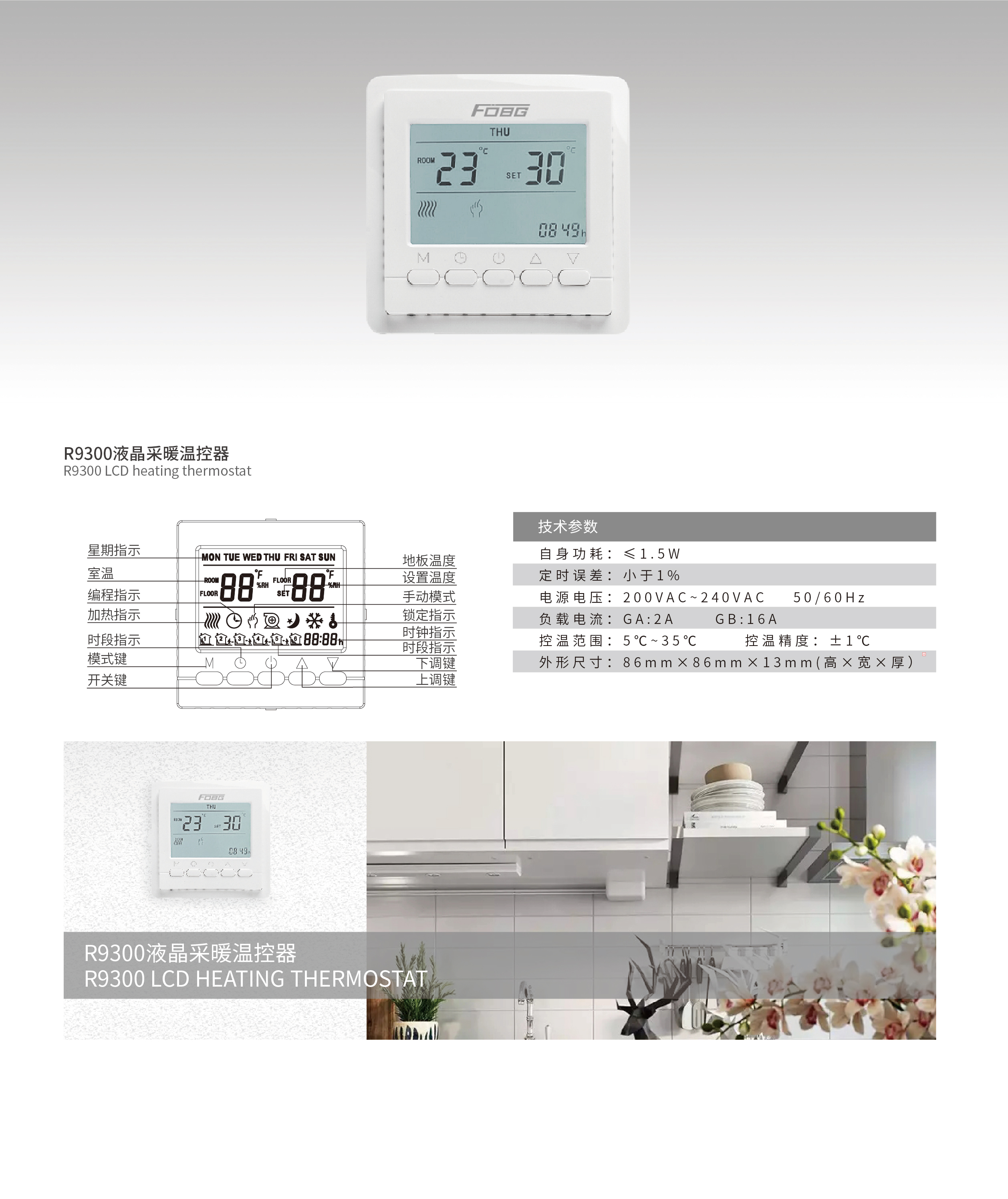 弗兰博格 (FOBG) 温控面板 温控器用于分室温控和分户温控地暖系统,通过感应房间的温度和设定温度的对比,来控制地暖系统的运行状态。提高舒适度的同时,达到节能的目的。